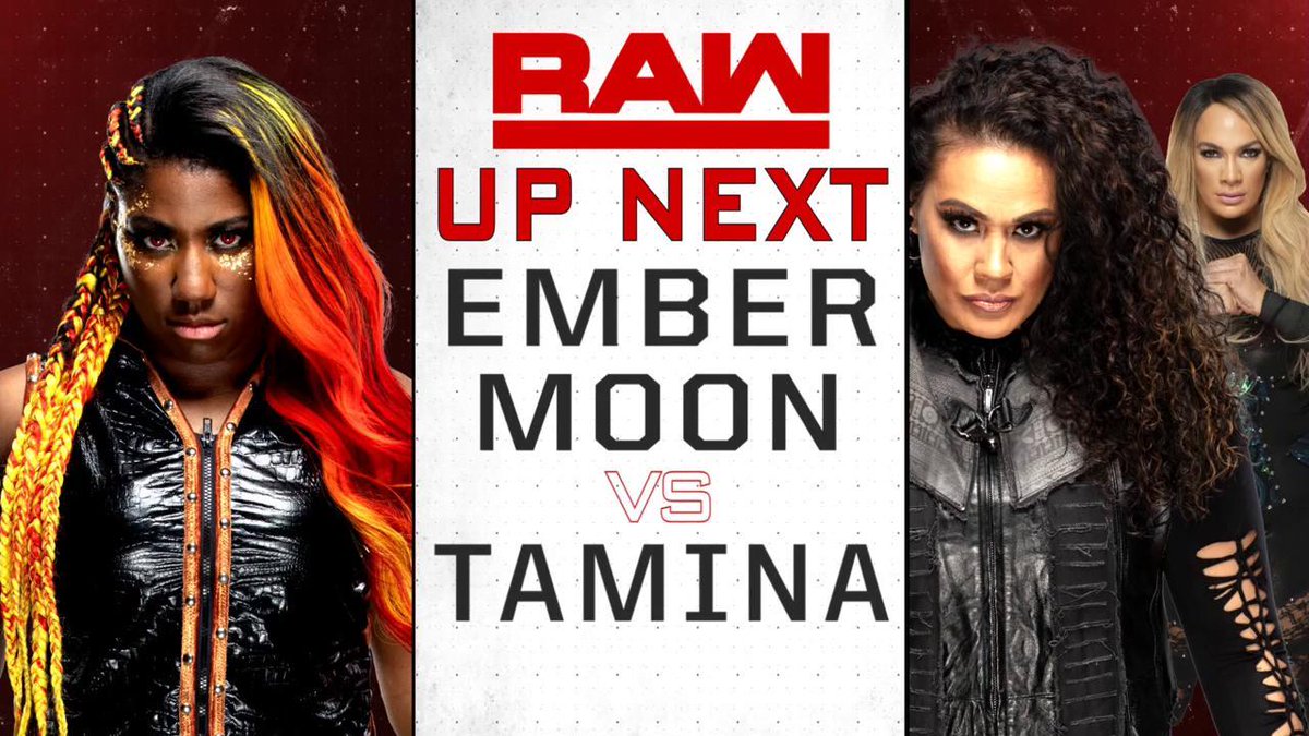 Ember Moon vs. Tamina (c/Nia Jax). Alexa Bliss miraba el combate en backstage buscando a quienes integrarán el RAW Women’s Team. Nia intervino como agente distractorio en Ember para favorecer a Tamina. Una de ellas le permitió a la hija de Jimmy Snuka imponerse luego de un Superfly Splash. Posterior al triunfo, Nia también atacó a Ember.