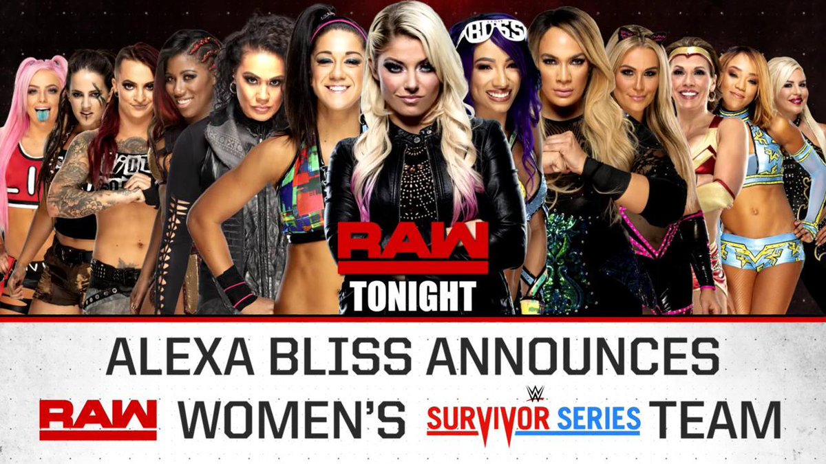 La capitana del equipo rojo femenino llega al ring acompañada de Mickie James, Nia Jax y Tamina. A ellas las presenta como parte de las elegidas y también a Natalya, pero que no está presente para que se reponga de sus fuertes emociones vividas recientemente. Sobre la última integrante, Alexa precisa de dos luchadoras que deberán probar que son capaces de todo por estar en el equipo, incluso dejando de lado su amistad, por lo que las enfrentará para que la ganadora del combate se una al equipo de Survivor Series: Sasha Banks y Bayley.