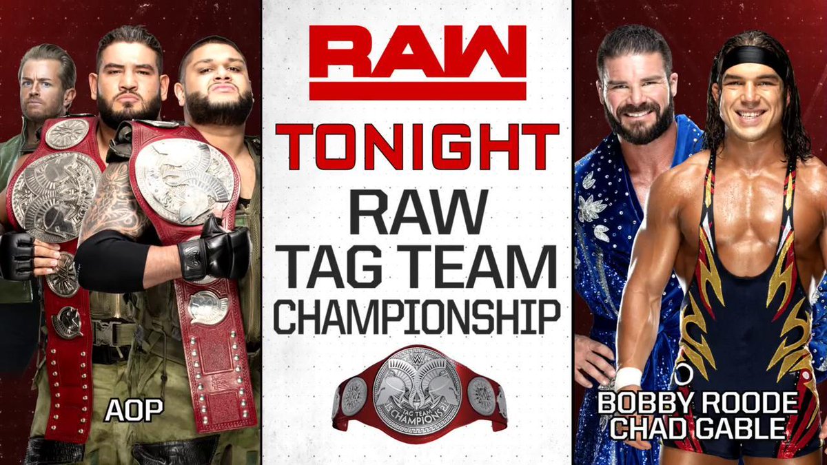 RAW TAG TEAM CHAMPIONSHIP MATCH: AoP (c/Drake Maverick) (C) vs. Bobby Roode & Chad Gable. Antes de la lucha, los retadores son entrevistados por Charly Caruso, donde Gable le dice que esta lucha es el resultado de la razón por la cual le pidió a Roode hacer equipo con él. Roode avisa que lucharán y ganarán para hacer la RAW Tag Team Division “Gloriosa”. En el ring, Maverick se roba la bata de Roode y luego se muestra en el baño orinando sobre la prenda. Esto causa la distracción del Glorioso, a quien Rezar estrella contra Gable y le aplican junto a Akam la combinación Neckbreaker-Sitout Powerbomb para que AoP sigan siendo los RAW Tag Team Champions.