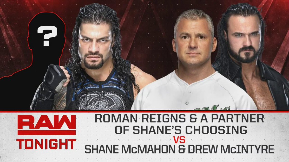 Backstage: Se muestra a Roman Reigns siendo entrevistado por Charly Caruso, quien le pregunta por la lucha que sostendrá esta noche ante Shane McMahon y Drew McIntyre con un compañero que el mismo Shane le pondrá al lado. Roman le dice que no busque un titular, porque ni ella ni él saben quién lo acompañará en la lucha y que hay mucha gente que usa guerra psicológica.