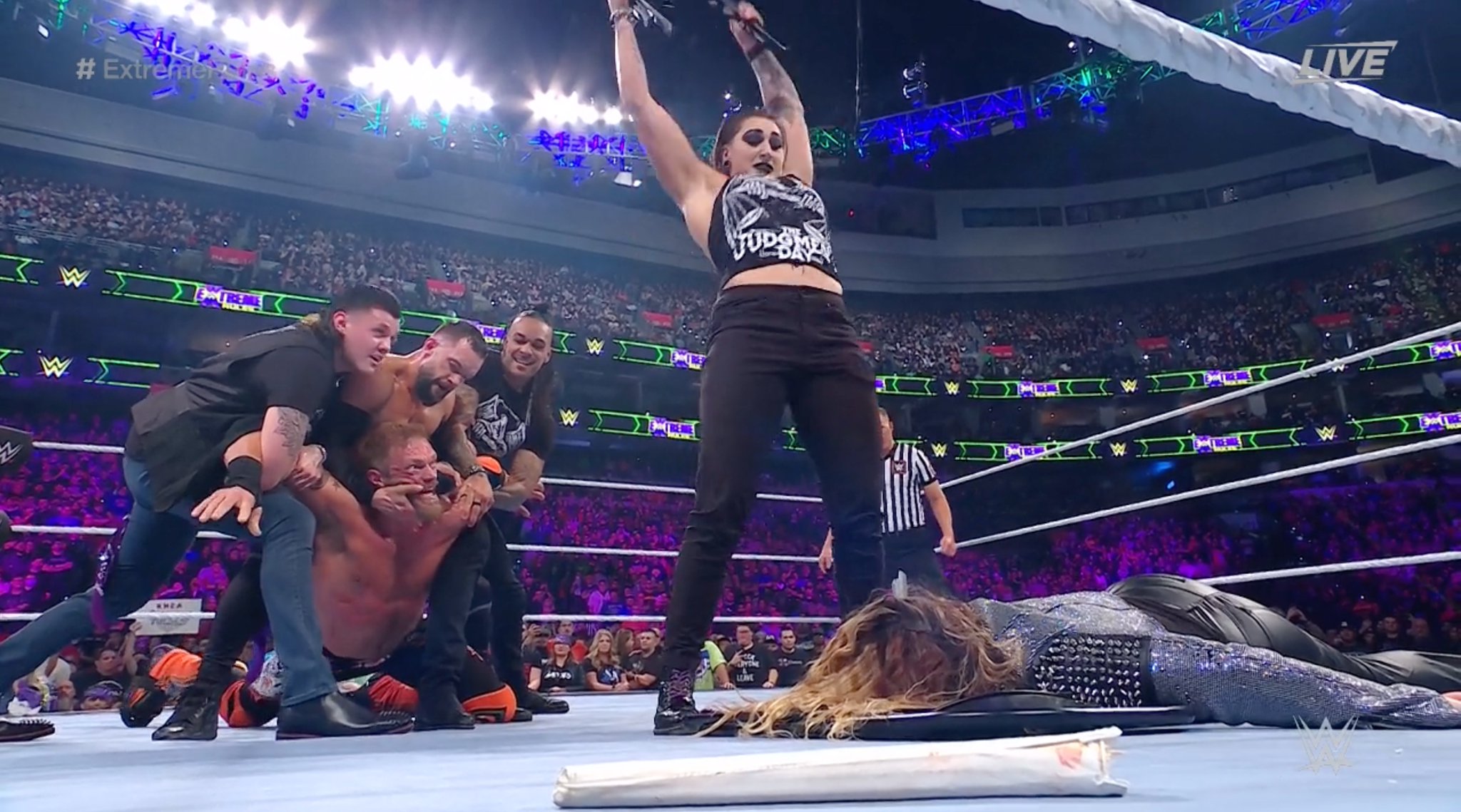 Llegó la lucha entre el líder y el creador de The Judgment Day, una vez que Finn Bálor y Edge se enfrentaron en un “I Quit” Match. Una lucha que tuvo la componente violenta que ambos prometieron y que demandaba la estipulación, donde se pasearon por varias partes del Wells Fargo Center y en donde Edge usó un palo de hockey para cruzárselo por la boca a Bálor como siempre lo hacía con el fierro de las patas de las sillas. Pero la lucha adquirió un cariz más dramático con la presencia del resto de The Judgment Day, quienes esposaron a Edge y lo dejaron a merced de Bálor y un Kendo Stick para las inminentes palabras a decir para darse por vencido. Sin embargo, apareció Rey Mysterio y equilibró las cargas, siendo anulado por su propio hijo Dominik y parecía que Edge ya no tendría escapatoria de no ser por la repentina aparición de Beth Phoenix, quien destrozó el Kendo Stick en los cuerpos de los integrantes de The Judgment Day. Ahora era Edge quien se encaminaba a la victoria con tres Spears en línea y el fierro de la silla en la boca de Bálor, pero nuevamente salieron los de The Judgment Day, donde Rhea Ripley empleó una manopla para noquear a Beth. Con la amenaza de un Con-Chair-To de Rhea a Beth, Edge decidió proteger a su esposa y entregar la lucha con el “I Quit” correspondiente, pero de nada serviría, ya que Rhea consumaría igual su amenaza y dejó caer la silla en la cabeza de la Glamazon.